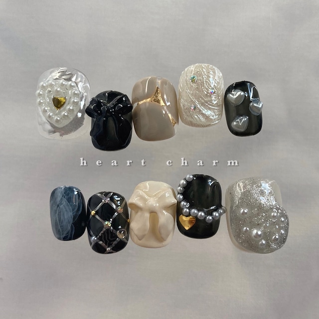 heart charm|ニュアンスネイル ネイルチップ 韓国ネイル 韓国風ネイル ハートネイル リボンネイル ぷっくりネイル シルバーネイル ブラックネイル インクネイル