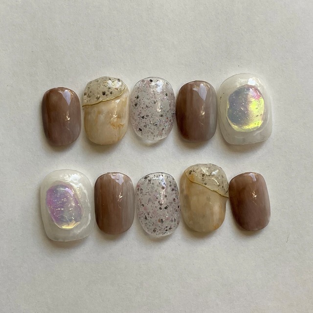 ぷっくりオーロラが目を引きます✨ ブラウン系で落ち着いたデザイン◎ 淡色好きな方へ〻 :ご覧いただきありがとうございます: ご購入の前に必ずサイズ表を確認した上で サイズ記入欄にて親指からサイズをお書きください。 ※ oyunailではサイズオーダーをご希望の方には ネイルチップご購入前に計測用チップを ご利用いただくことをおすすめしております。 長さやカーブの確認もできるので大変おすすめです。 ⚪︎見本の写真はすべてベリーショートで制作しております。 ⚪︎粘着シール1回分とウッドスティック1本、ミニヤスリもお付けしております。 お手数ですがご購入の際は必ず ショップ情報をお読みください。 Instagram:@oyunailll ご注文を受けたネイルチップの写真や新作など 随時更新しております。 よろしければフォローお願いします ☽ ______________________________ ネイルチップ 韓国風ネイル 韓国ネイル グラデーションネイル マーブルネイル マグネットネイル チェックネイル サンドネイル フレンチネイル 立体ネイル 秋冬ネイル