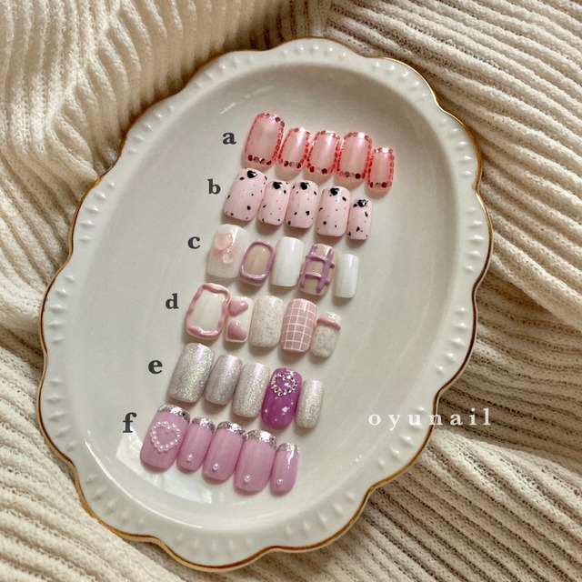 こちらは片手ずつデザインをお選びいただけます✴︎ 左右それぞれのデザインをお選びください。 もちろん両手とも同じデザインでも構いません◎ ※cの親指のハートは紫外線を当てるとピンクに変わります ※こちらの商品のフラット加工やトップコート二重仕上げをご希望の方は ご購入前にお問い合わせください :ご覧いただきありがとうございます: ご購入の前に必ずサイズ表を確認した上で サイズ記入欄にて親指からサイズをお書きください。 ※ oyunailではサイズオーダーをご希望の方には ネイルチップご購入前に計測用チップを ご利用いただくことをおすすめしております。 長さやカーブの確認もできるので大変おすすめです。 ⚪︎見本の写真はすべてスクエアで制作しております。 ⚪︎粘着シール1回分とウッドスティック1本、ミニヤスリもお付けしております。 お手数ですがご購入の際は必ず ショップ情報またはABOUTをお読みください。 Instagram:@oyunailll ご注文を受けたネイルチップの写真や新作など 随時投稿しております。 よろしければフォローお願いします➿ ______________________________ ネイルチップ 韓国風ネイル 韓国ネイル グラデーションネイル マーブルネイル マグネットネイル チェックネイル サンドネイル フレンチネイル 立体ネイル 秋冬ネイル ワンホンネイル 春ネイル フレンチガーリー ホワイトネイル ピンクネイル ぷっくりネイル