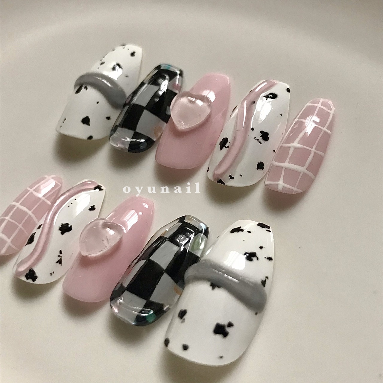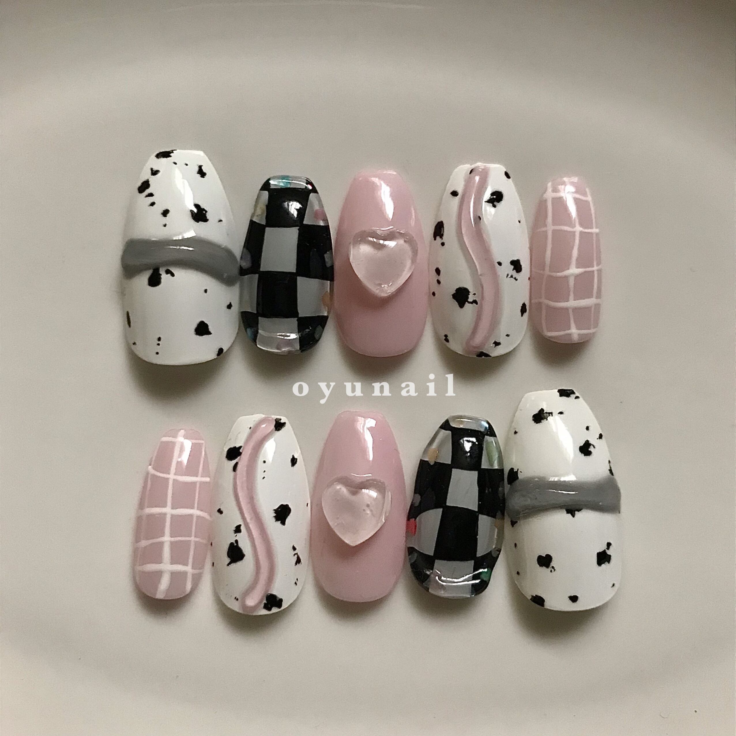 cowgirl|韓国ネイル 韓国風ネイル ワンホンネイル ネイルチップ ハートネイル ピンクネイル ホワイトネイル うずらネイル 牛柄ネイル チェックネイル ぷっくりネイル