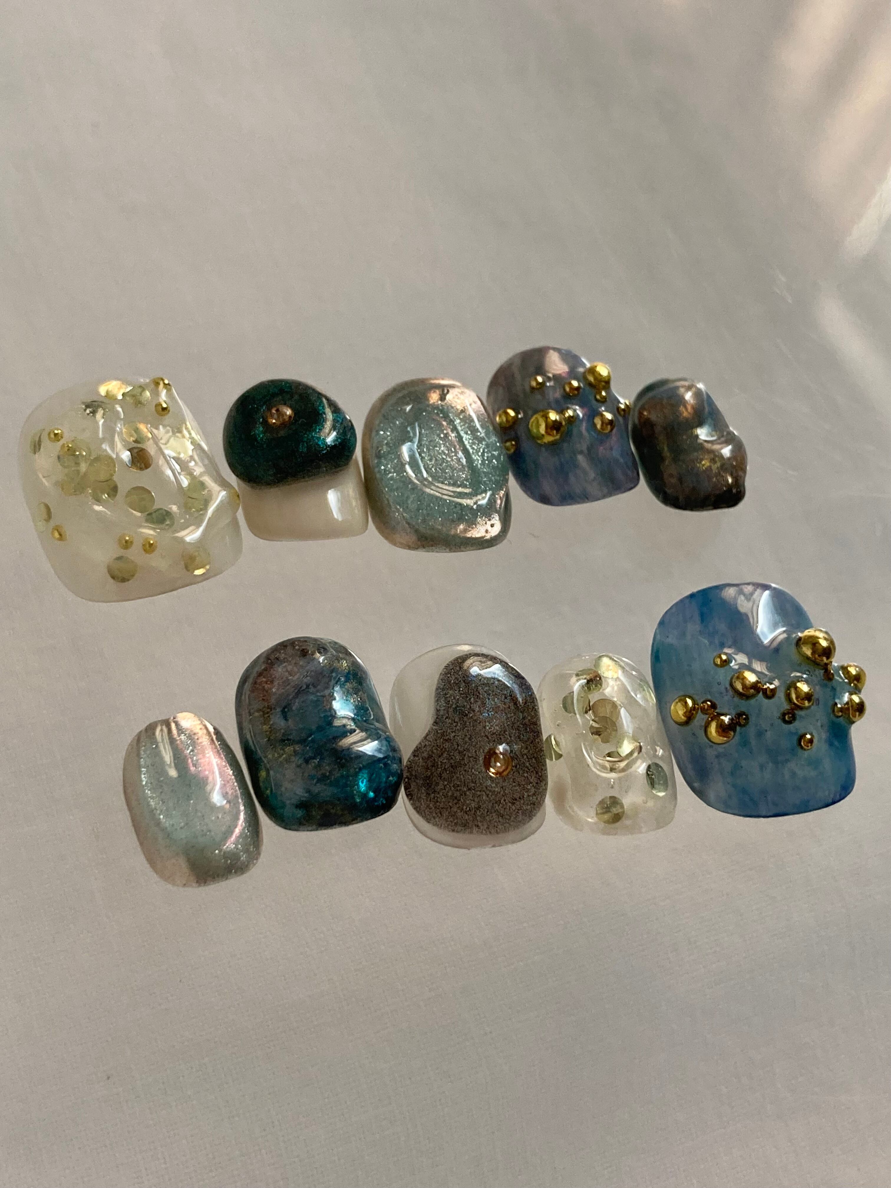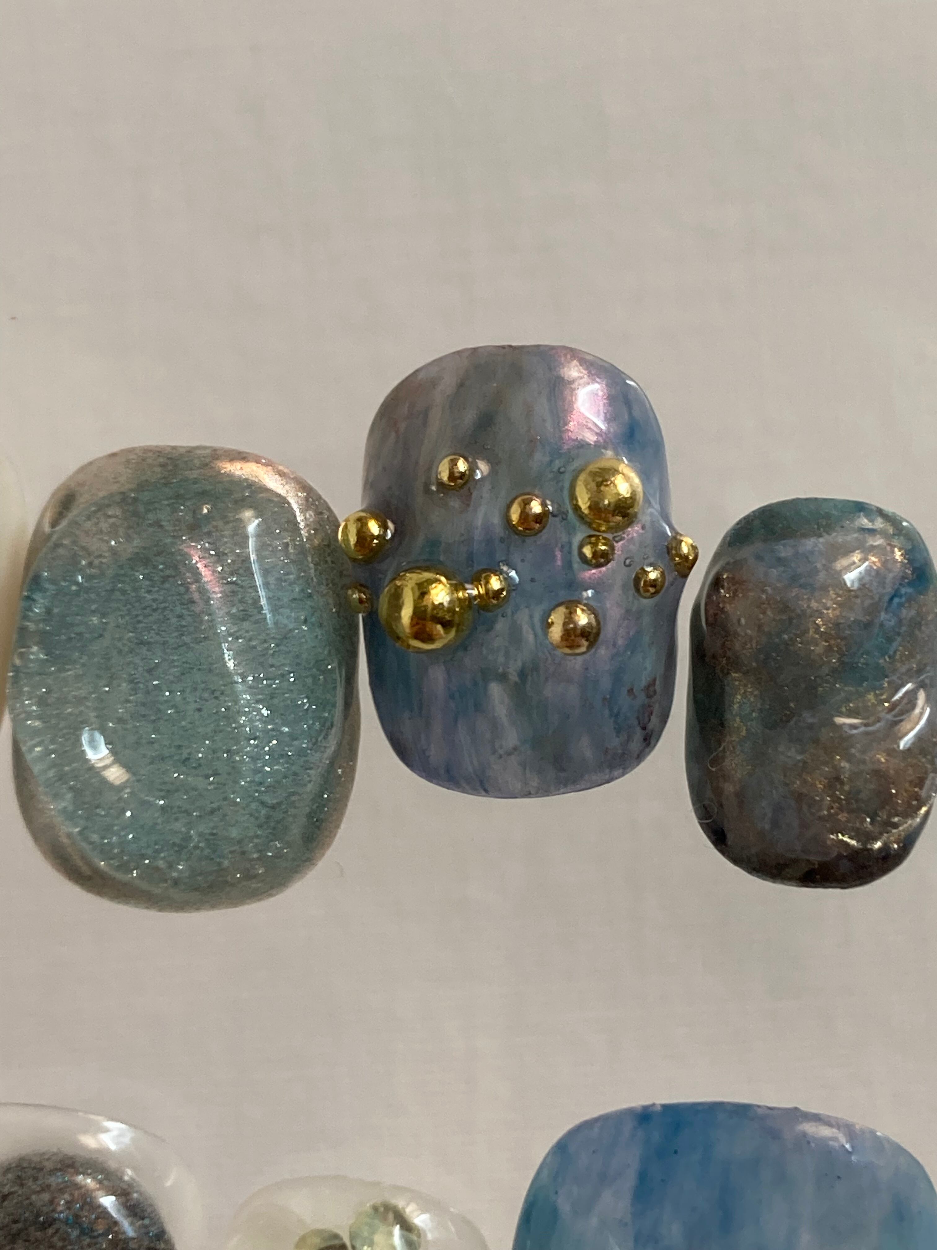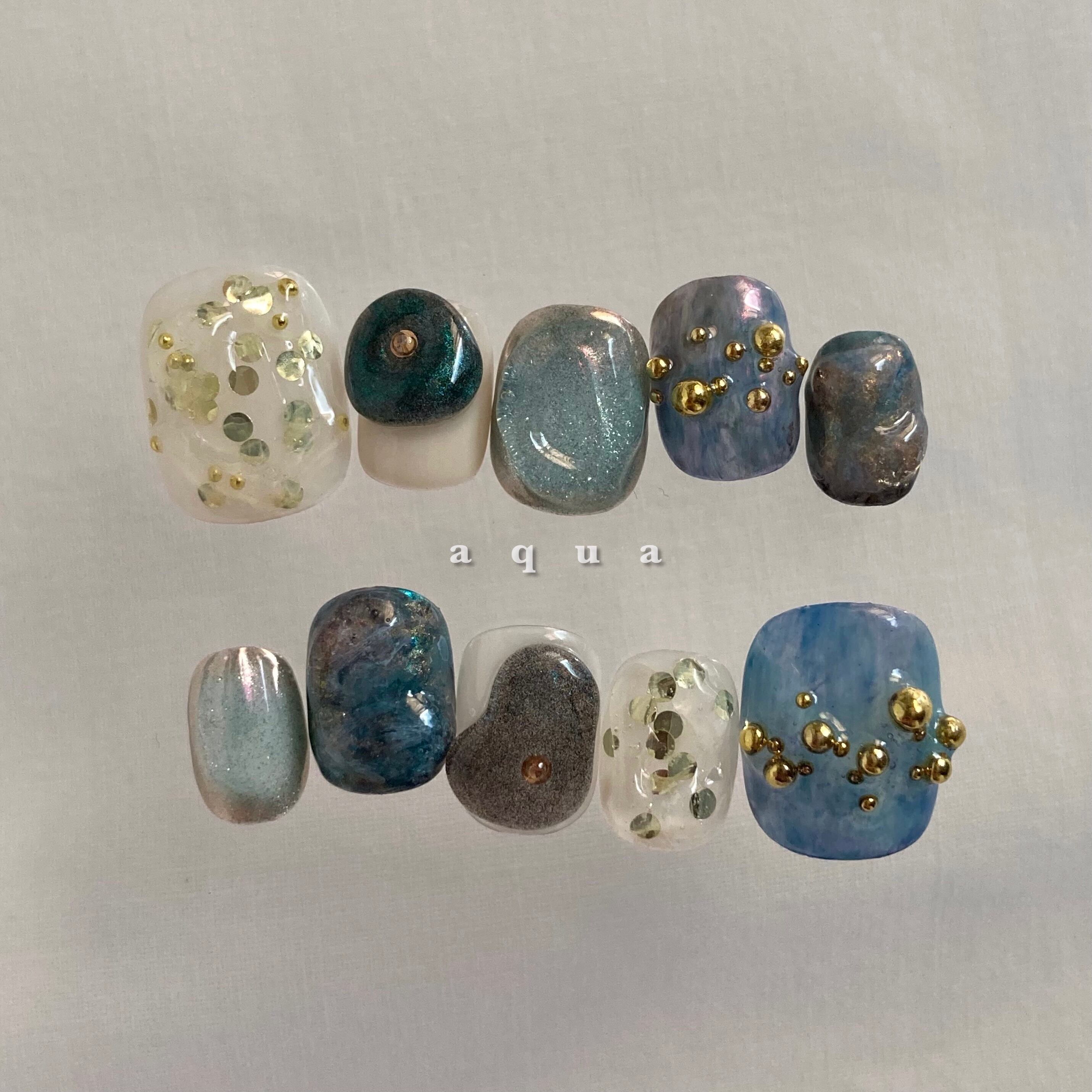 aqua|ニュアンスネイル ネイルチップ ブルーネイル ゴールドネイル ぷっくりネイル インクネイル マグネットネイル おはじきネイル 鉱物ネイル