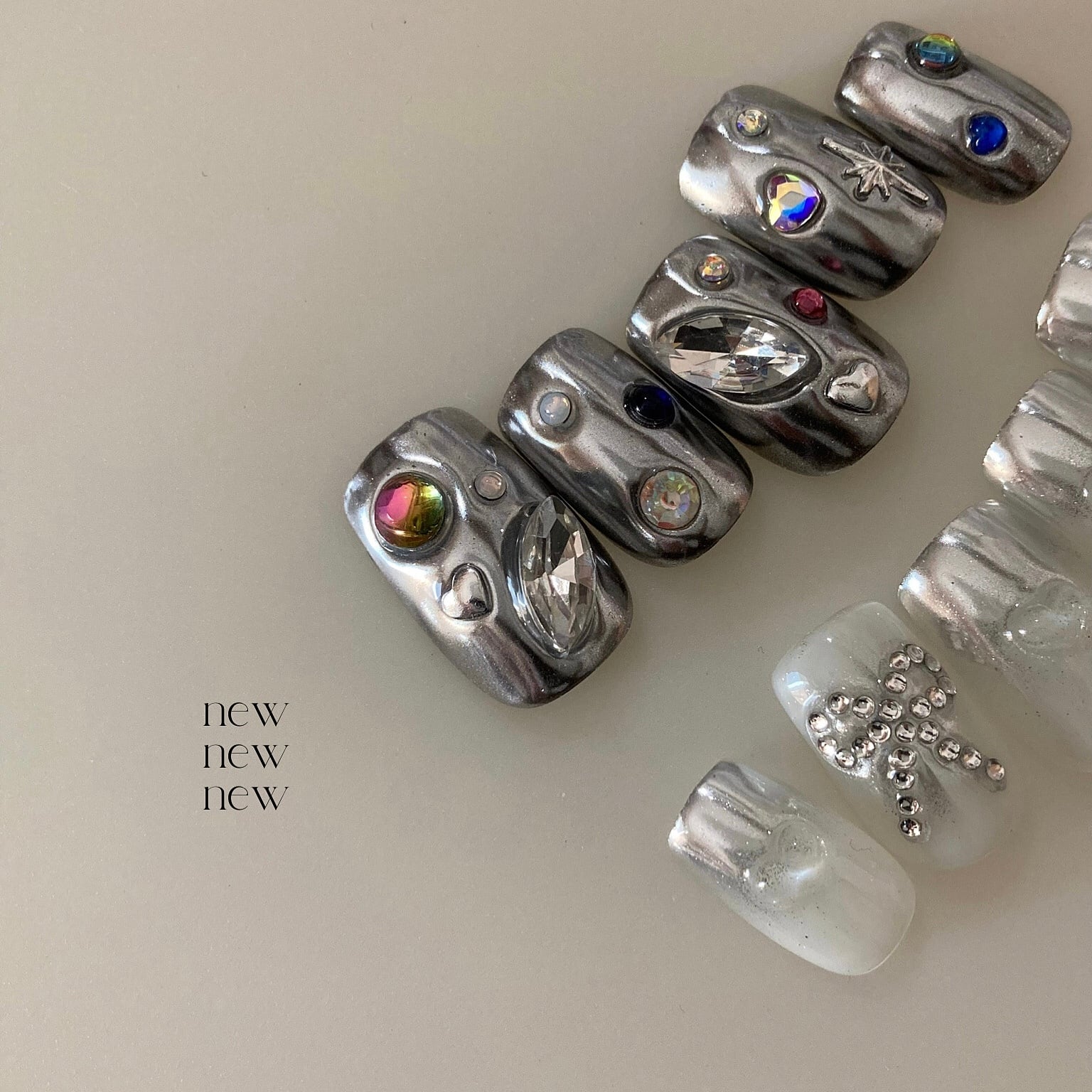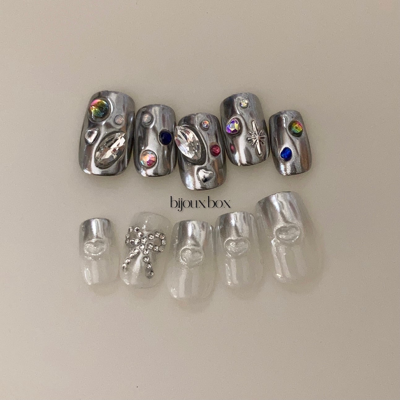 bijoux box|韓国ネイル 韓国風ネイル ネイルチップ ビジューネイル シルバーネイル Y2Kネイル シンプルネイル リボンネイル ハートネイル ぷっくりネイル ニュアンスネイル