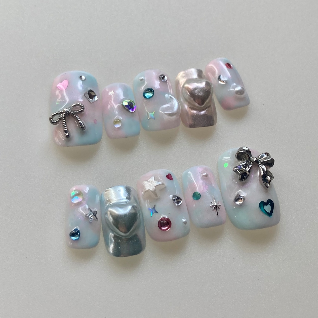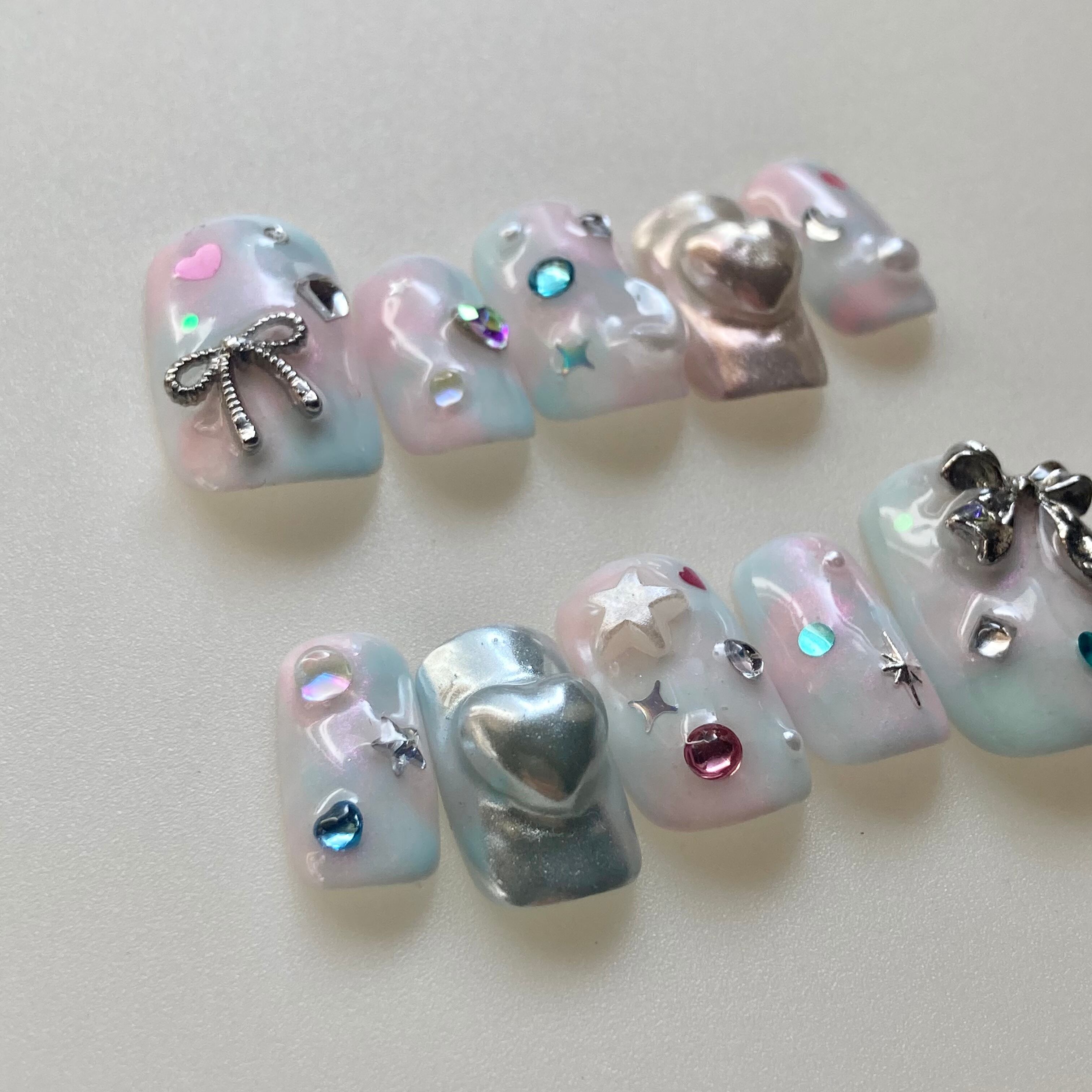 marble|韓国ネイル 韓国風ネイル ネイルチップ ピンクネイル ブルーネイル リボンネイル ハートネイル Y2Kネイル マーブルネイル ぷっくりネイル