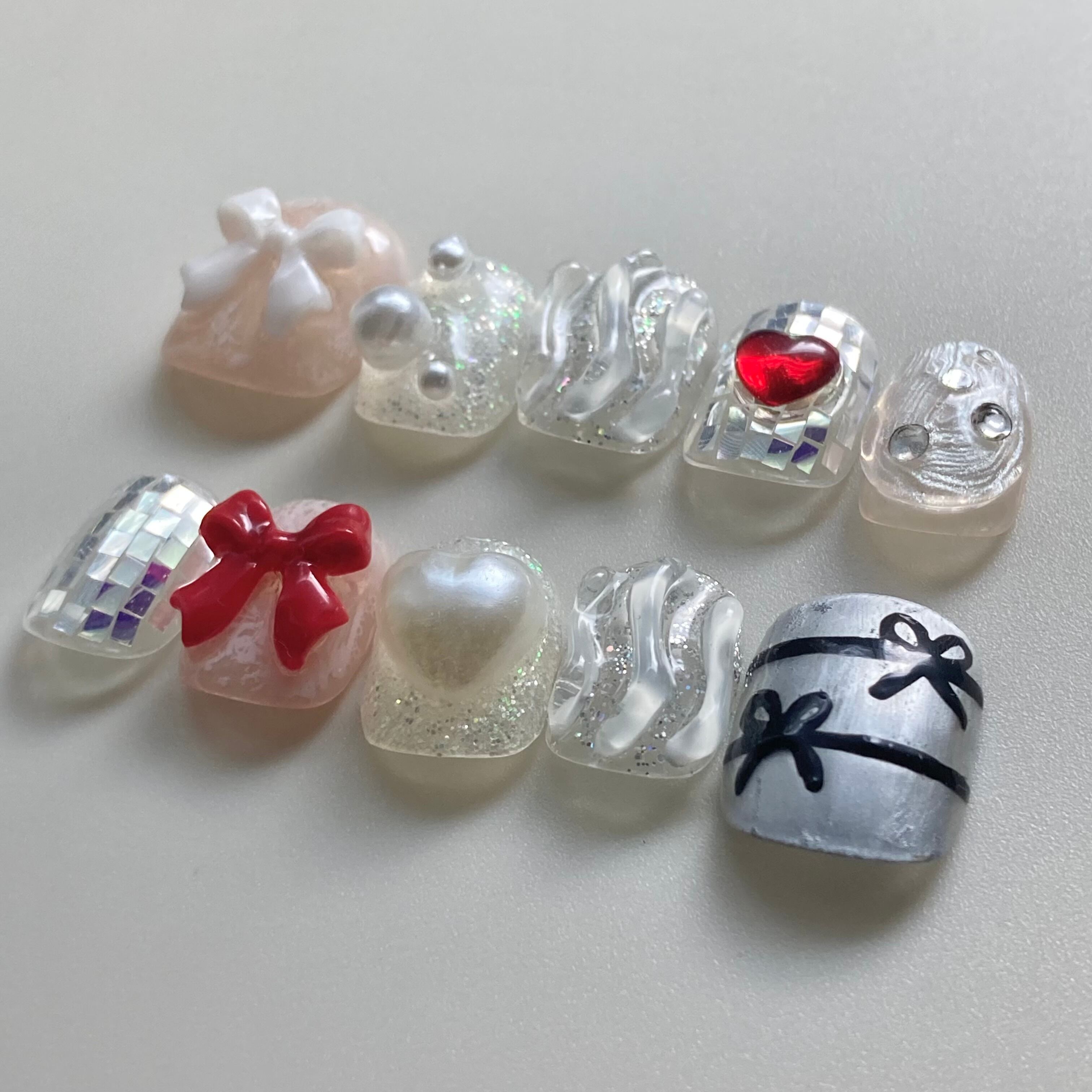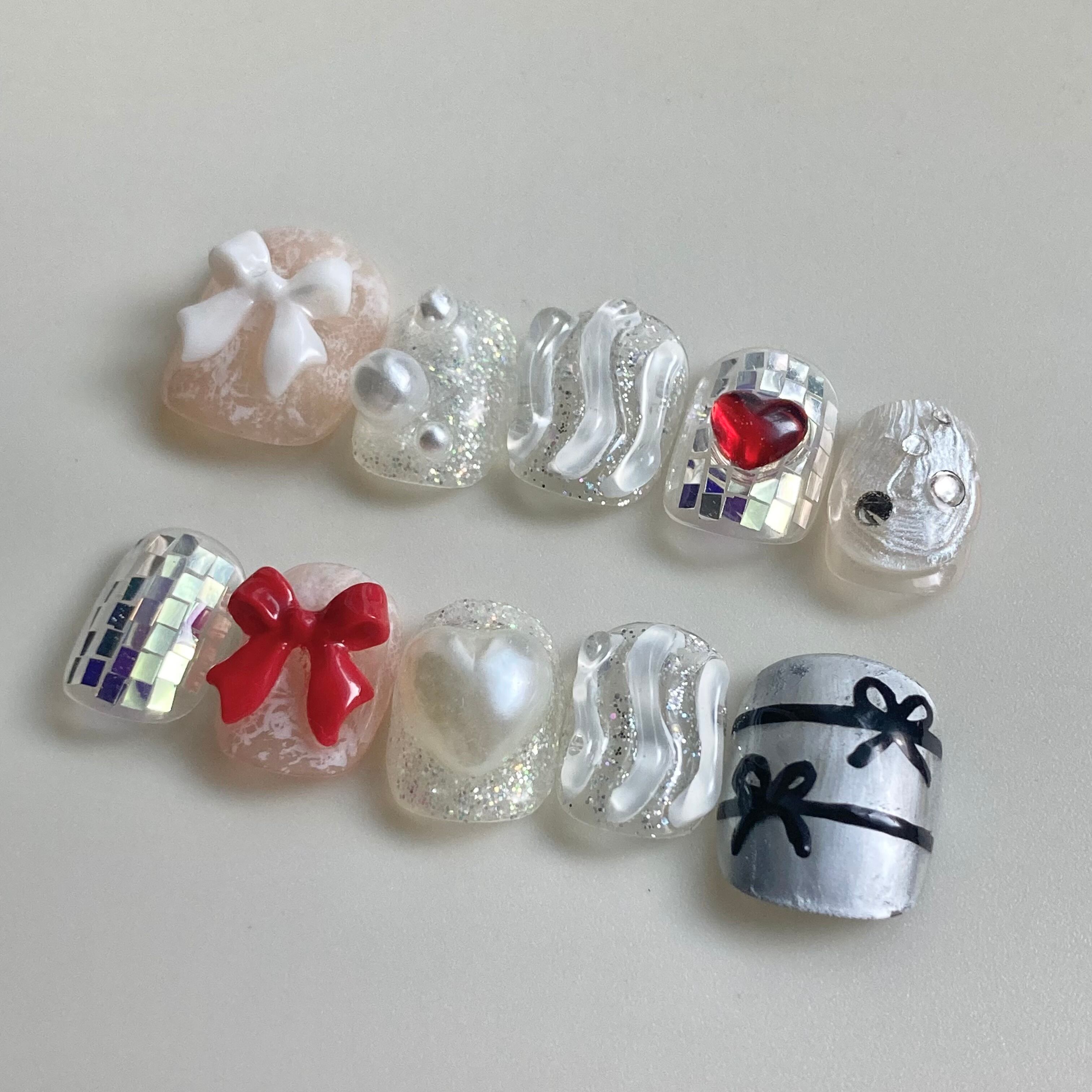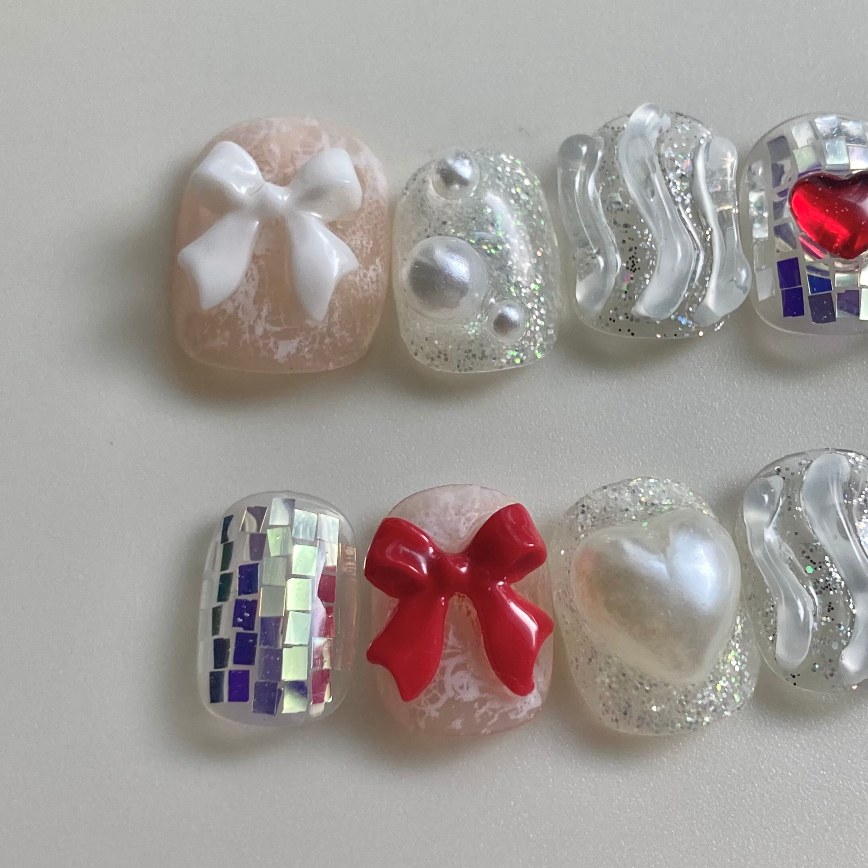 ネイルチップ 韓国風ネイル 韓国ネイル マグネットネイル ホワイトネイル シルバーネイル シンプルネイル ニュアンスネイル ぷっくりネイル 秋冬ネイル 成人式ネイル リボンネイル Y2Kネイル