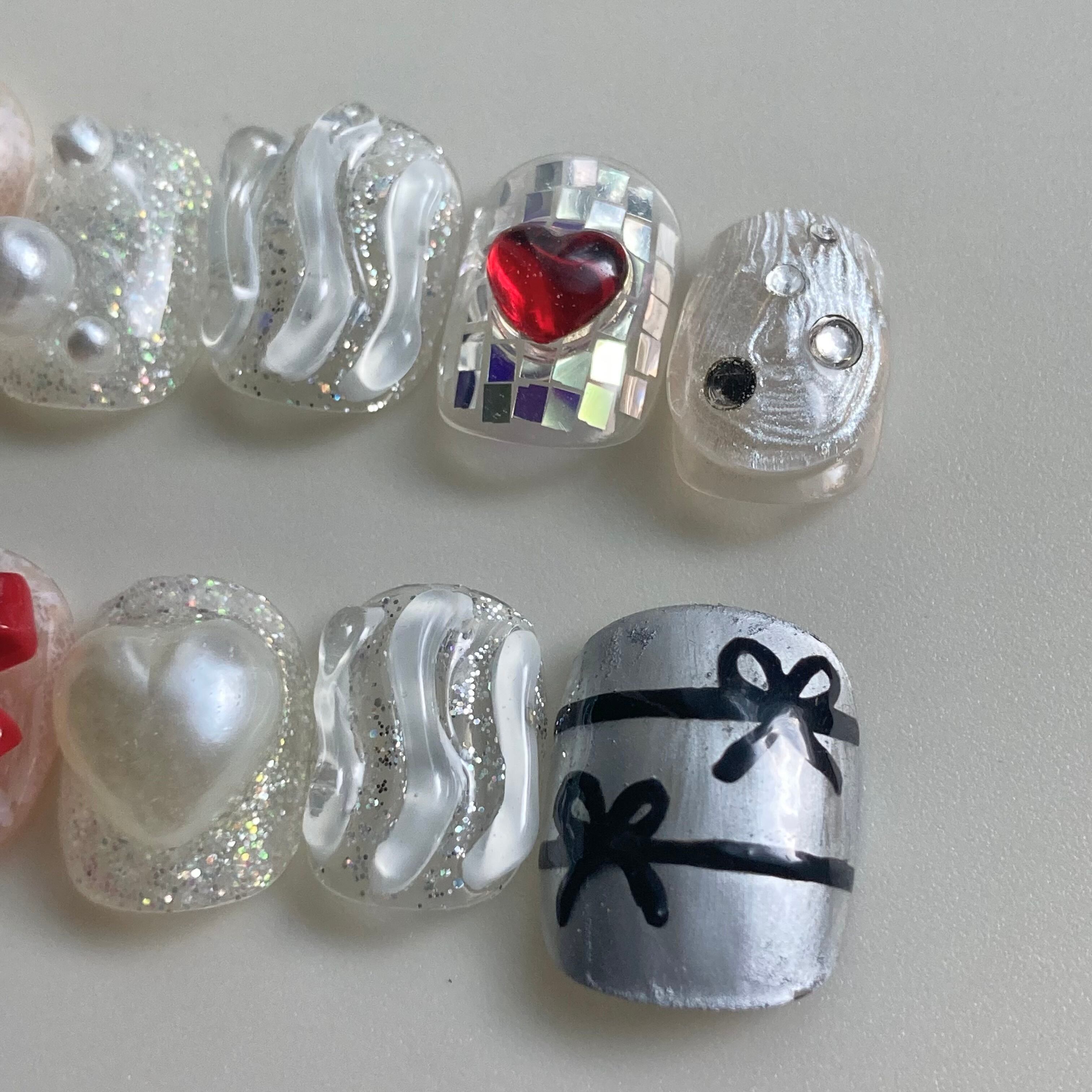 lace up|韓国ネイル 韓国風ネイル ネイルチップ ニュアンスネイル リボンネイル ハートネイル ホワイトネイル シルバーネイル ぷっくりネイル 個性派ネイル パールネイル